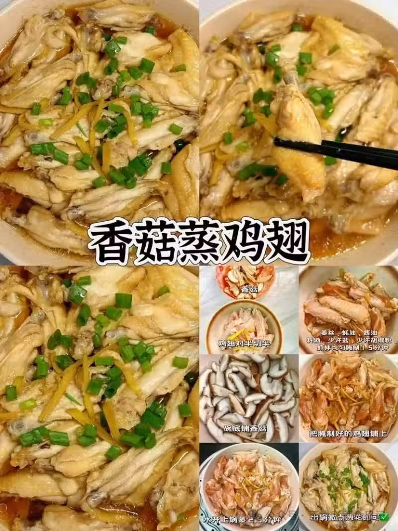 碗底鋪香菇,把腌制好的雞翅鋪上,水開上鍋蒸25分鐘,出鍋撒點蔥花即可。