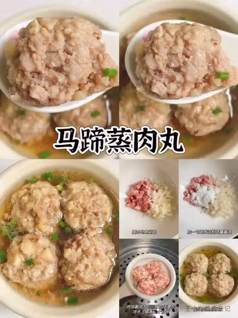 豬肉馬蹄剁碎,加一勺玉米澱粉、適量醬油,肉餡戳成丸子形狀加適量水,冷水上鍋蒸二十分鐘,起鍋後撒點蔥花。