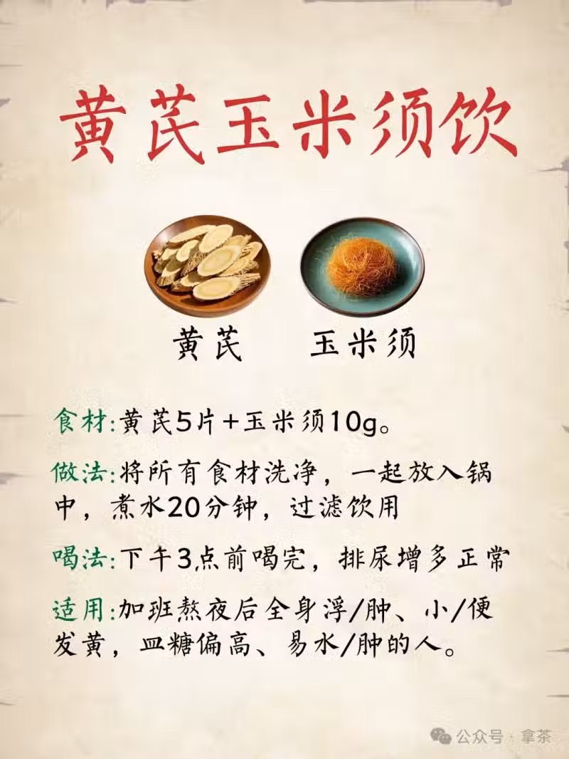 適用:加班熬夜後全身浮/腫、小/便發黃,皿糖偏高、易水/腫的人。