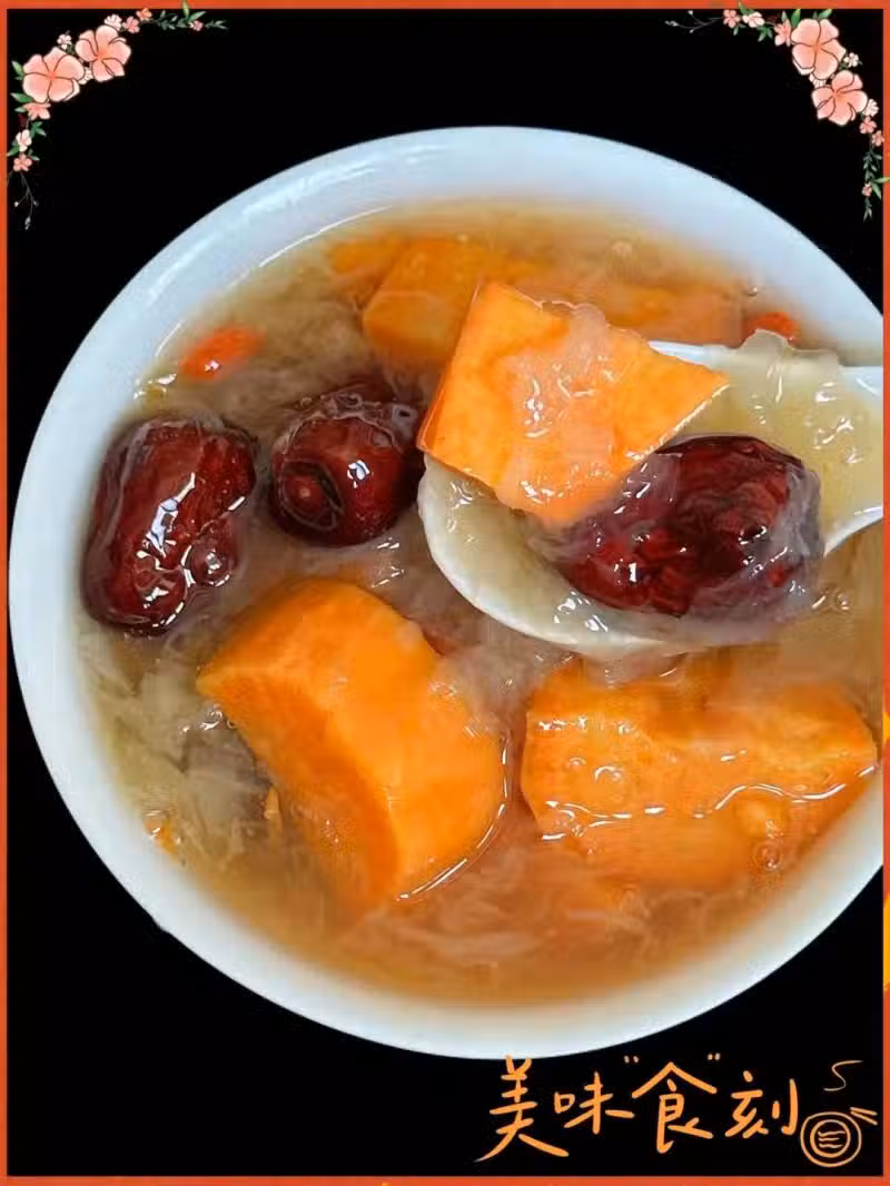 喝它能潤潤喉、養養嗓子,紅薯軟乎香甜,銀耳黏滑水潤,喝完全身都輕鬆舒服,特別是女性,真的可以多喝喝,好氣色這不就來了