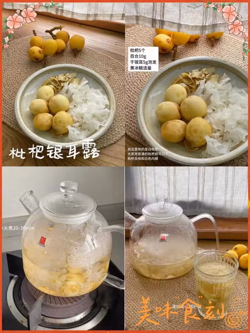 1. 干銀耳提前2小時用溫水泡發,撕成指甲蓋大小朵;百合用清水泡10分鐘洗好;枇杷剝皮去掉核(核裡面的白膜也要撕掉),把果肉切成小塊。