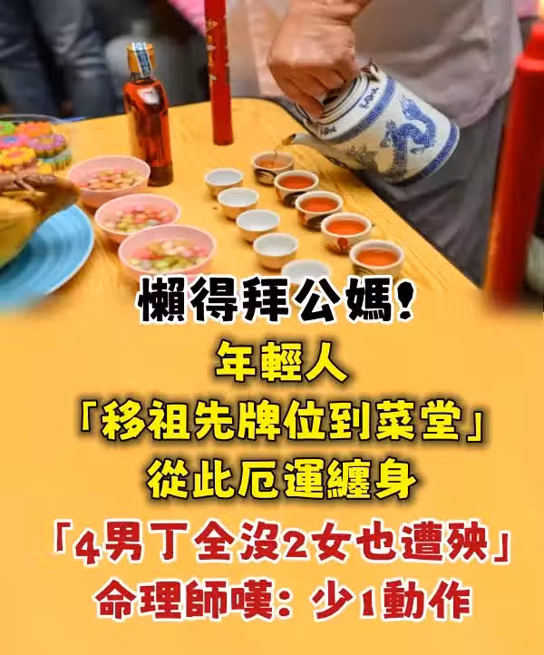 在華人文化中提倡慎終追遠,每年清明節更是年度大事,不過隨著時代變遷,年輕一輩對於祭祀的習慣逐漸淡化,可能會選擇不繼續祭拜祖先...不料近日一家的年輕人因為都不想祭拜,隨意將祖先移到「菜堂」,最後卻發生一樁難以解釋的悲劇,「一個一個都沒了」!