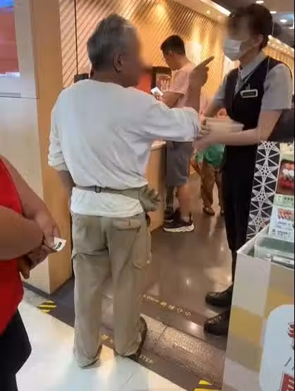 女店員面對老翁的不合理要求,禮貌且有耐心地安撫,並解釋其他客人都有提取號碼牌。