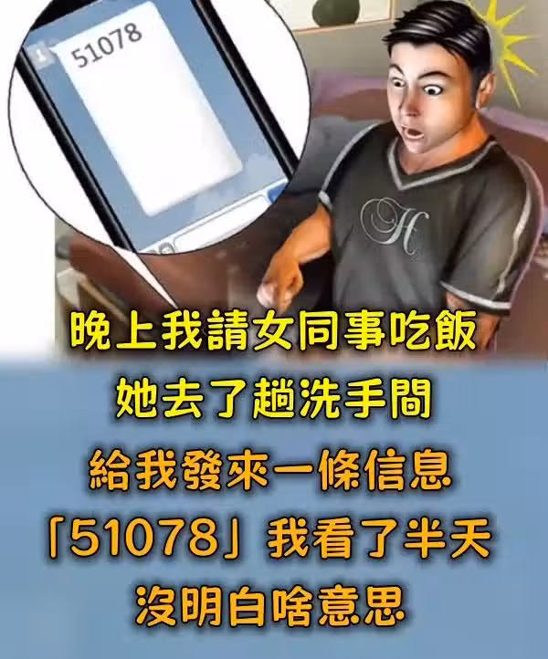 晚上我請女同事吃飯,她去了趟洗手間,給我發來一條信息,「51078」,我看了半天,沒明白啥意思?