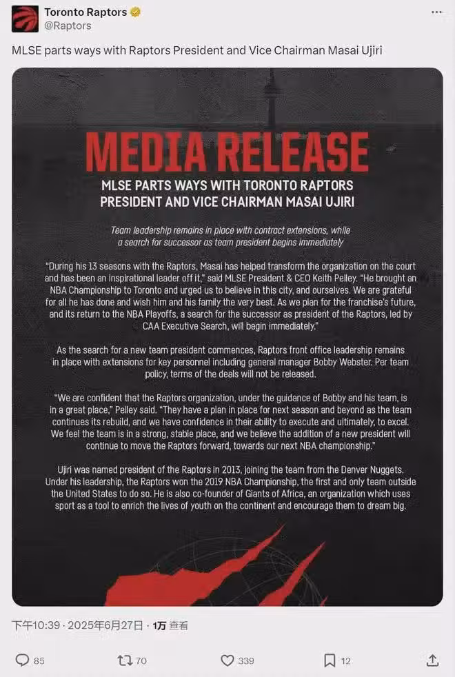 多倫多猛龍官方宣布:烏傑里不再擔任猛龍籃球運營總裁和球隊副主席,雙方分道揚鑣。烏傑里從2013年加入猛龍,已經管理這支球隊十幾年。而且,烏傑里的合同僅剩下一年,猛龍老闆居然提前將其解僱,這讓很多記者感到意外。