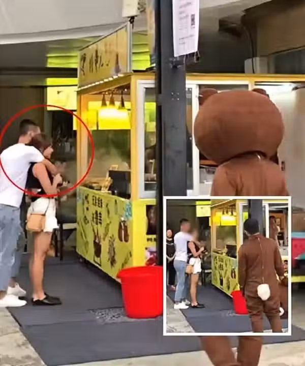 只見一系列照片中,穿著熊玩偶裝的男主角出現在一個公眾場合中,站在他對面的是一對互動親昵的男女,女子依偎在後方男子懷抱,模樣看起來相當甜蜜,這一切全被男主角看在眼裡,只見他脫下頭套,默默地注視著心愛的女友背著自己劈腿...