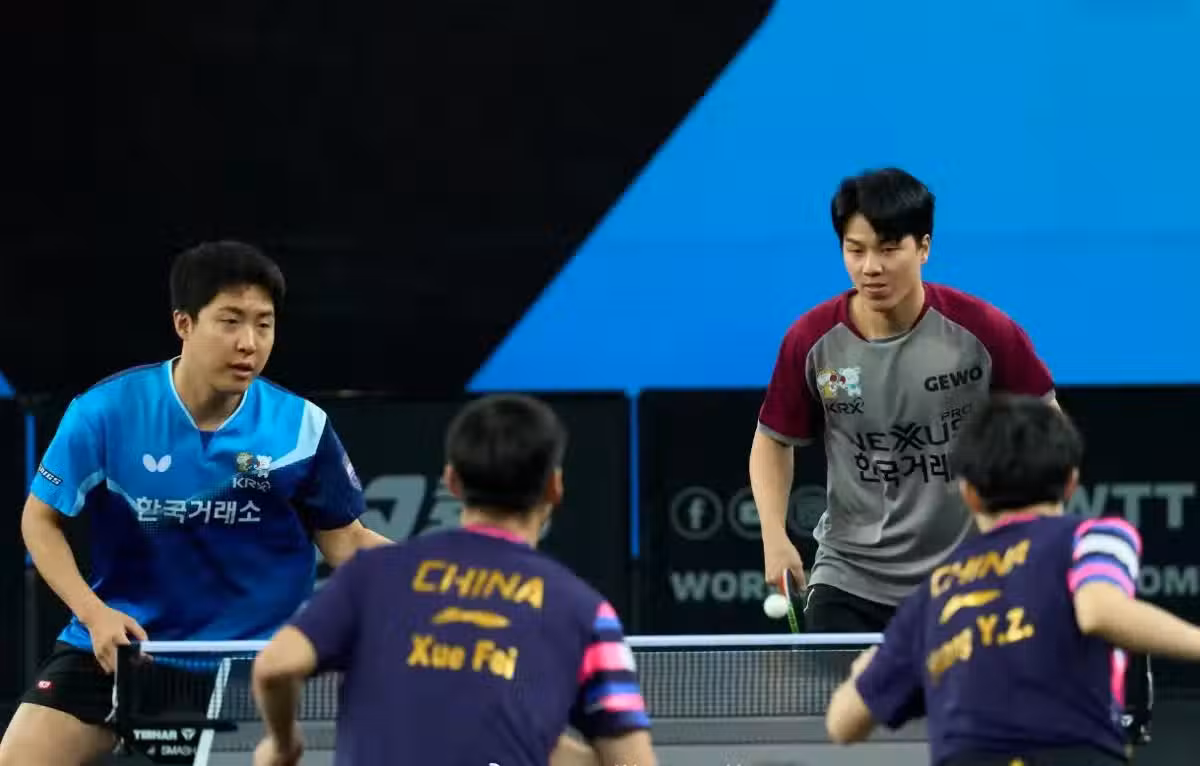 另外一場半決賽,黃友政/薛飛3-1戰勝安宰賢/林仲勛,還是比較意外的,硬實力看韓國組合是更強,國乒組合的特點都是正手突出,進入到相持對拉階段占優。