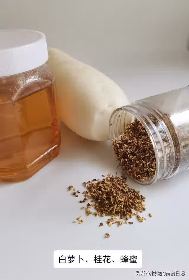 放入適量的桂花干,再淋上蜂蜜,量要能完全浸泡過桂花干哦。