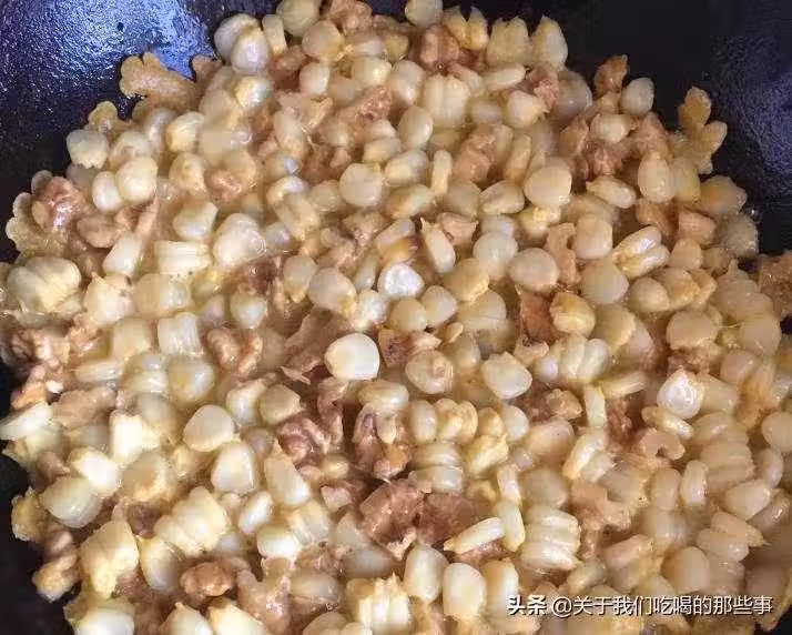 3、起鍋倒入少量油,燒熱後倒入核桃仁玉米粒,用鏟子壓平,小火煎2分鐘,煎至定型。