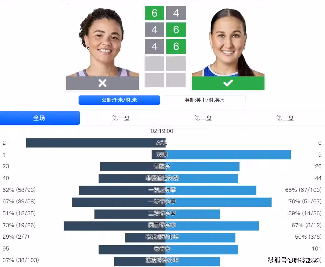 全場數據統計,拉克西莫娃出現9個雙誤、44個非受迫性失誤情況下,依然能夠實現逆轉,也體現了鮑里妮本場比賽打得更差,40個非受迫性失誤,一發成功率62%,一發得分率67%,二發得分率51%,破發點轉化為29%,接發球得分率37%,以上幾項數據都是不如拉克西莫娃。