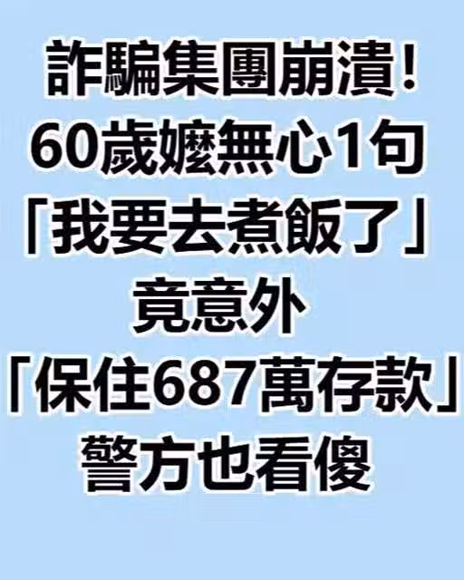 詐騙集團崩潰!60歲嬤無心1句「我要去煮飯了」 竟意外「保住687萬存款」警方也看傻!
