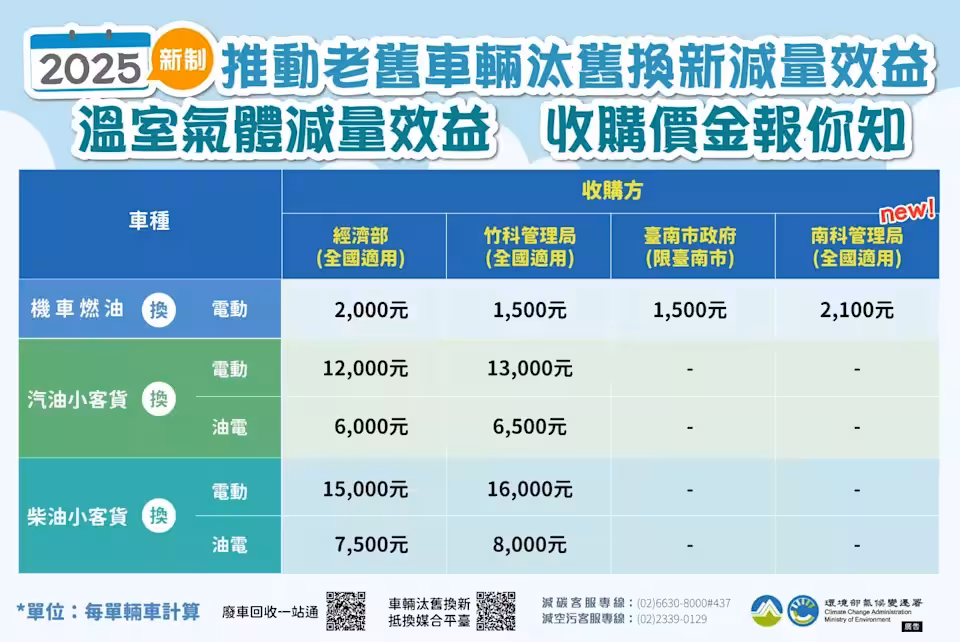 環境部宣布,國科會南部科學園區管理局7日起加入車輛汰舊換新媒合,提供每輛汰換機車收購金2100元,若加上減空污補助金、廢車回收獎勵金,車主至少可得3400元,為目前最高。