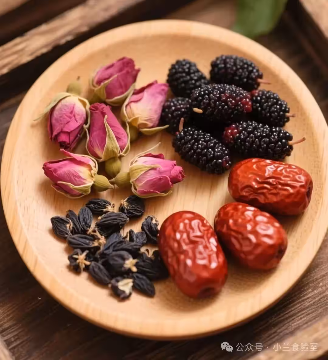 配方:玫瑰花5g + 桑葚6g + 黑枸杞4g + 紅棗(去核)3顆