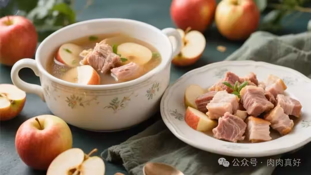 做法:蘋果1 個切塊,豬肉 50 克(選瘦肉切片或小塊),加水煮 30 分鐘,加點鹽調味,當娃的輔食湯,一周喝 1 - 2 次就行