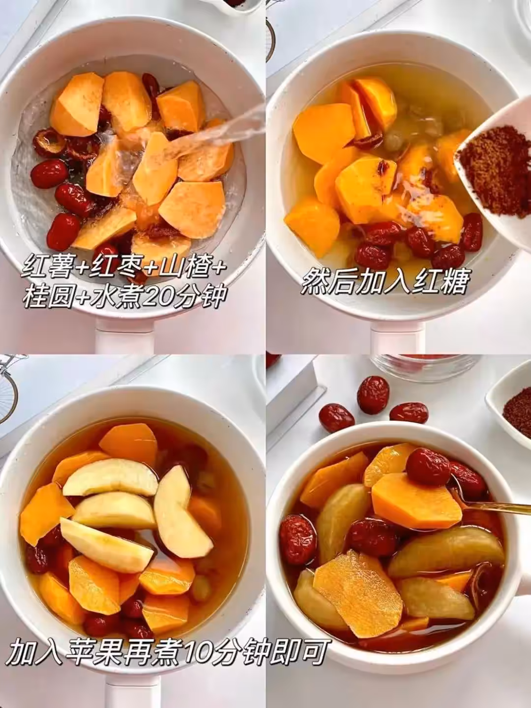 【食材】150g紅薯(選蜜薯更甜)、1個蘋果(帶皮切塊)、10顆紅棗(去核)、15顆桂圓(捏爆更出味)、5片山楂干、30g老紅糖、800ml純凈水