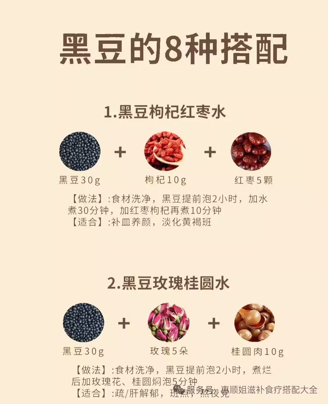 做法:黑豆30g、枸杞10g、紅棗5顆,洗凈後黑豆提前泡2小時,加水煮30分鐘,再加紅棗枸杞煮10分鐘。