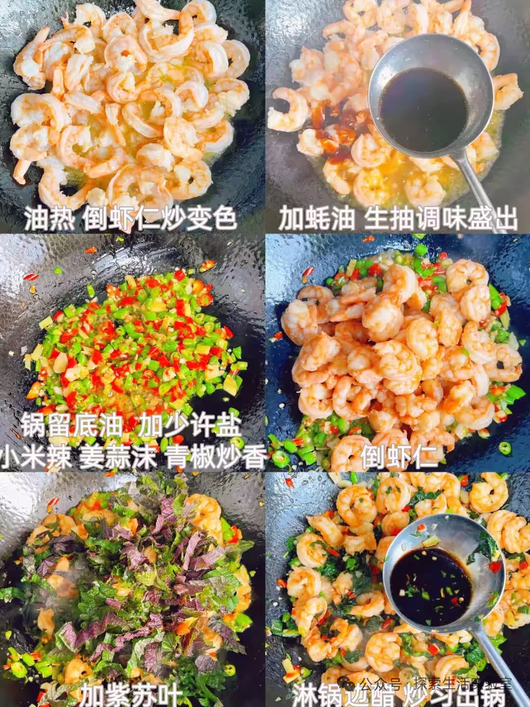 蝦仁200克、紫蘇葉8片、料酒1勺、澱粉半勺、生抽2勺