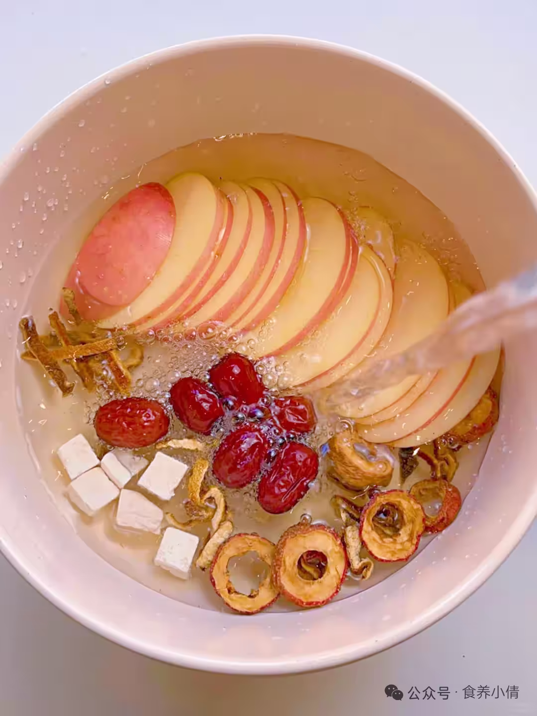 蘋果1個(去核切塊)、干山楂片5-6片、陳皮1小塊(約3克)、清水約1升。