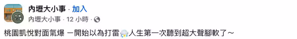 事後,一些目擊者嚇得在臉書「內壢大小事」分享此事,直呼「桃園凱悅對面氣爆,一開始以為打雷,人生第一次聽到超大聲腳軟了!」