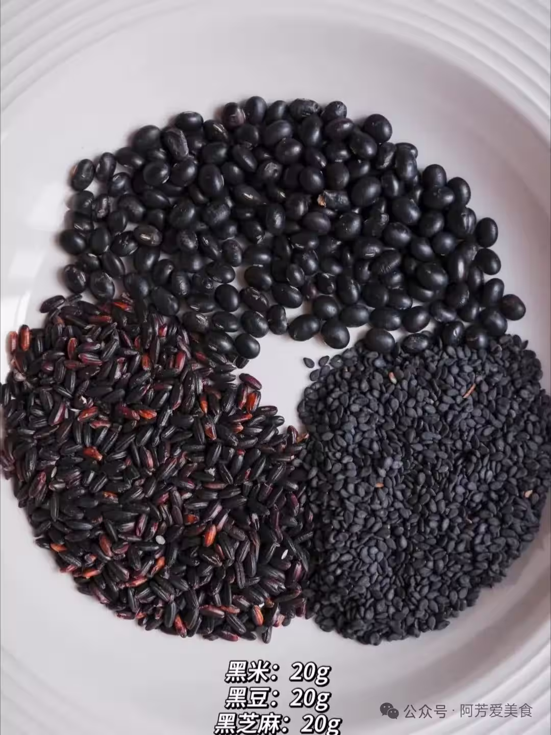 食材:黑米20g、黑豆20g、黑芝麻20g。