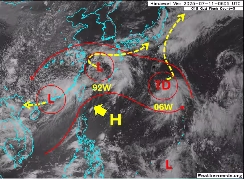 日本氣象廳公開颱風情報,說明位於日本南方的熱帶低氣壓a,11日朝西北西緩慢前進,到了12日將發展成颱風圈半徑130km的熱帶風暴,路徑預估往北北東方向。吳聖宇對此說明:「日本南方海面的熱帶性低氣壓06W則是有機會發展為今年第5號颱風百合 (Nari) ,大致往北發展,是否接近日本仍要再觀察,對台灣則沒有影響。」