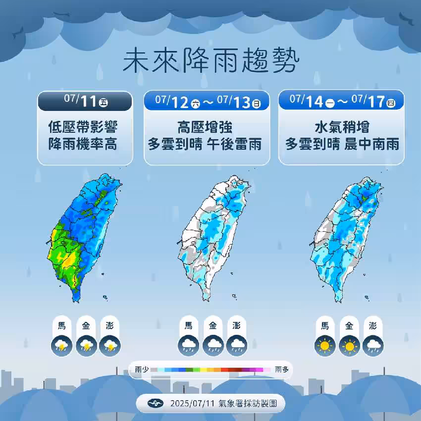 此外,台灣天氣又變天了!中央氣象署表示,下周一(14日)、下周二(15日)水汽增多,西半部有局部短暫陣雨,午後各地有局部短暫雷陣雨;下周五(18)水汽又增加,東部、東南部及恆春半島局部短暫陣雨,午後局部短暫雷陣雨。