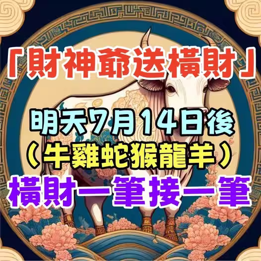 「財神爺送橫財」明天7月14日後,橫財一筆接一筆的生肖!
