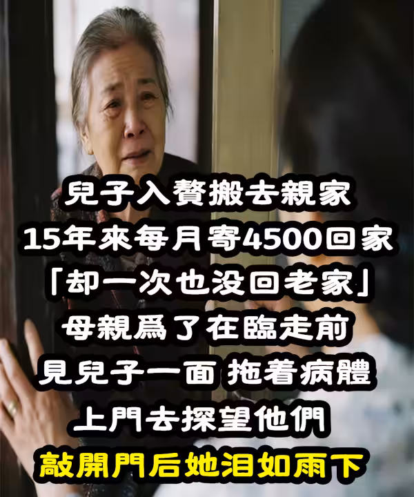 兒子入贅搬去親家!15年來每月寄4500回家「卻一次也沒回老家」...母親為了在臨走前見兒子一面,拖著病.體上門探望「敲開門她淚如雨下」
