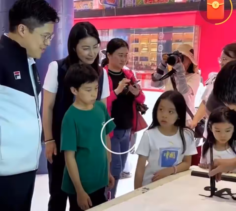 郭晶晶一家五口在貴州,俯身握手一點沒架子,衣服logo顯愛國情懷