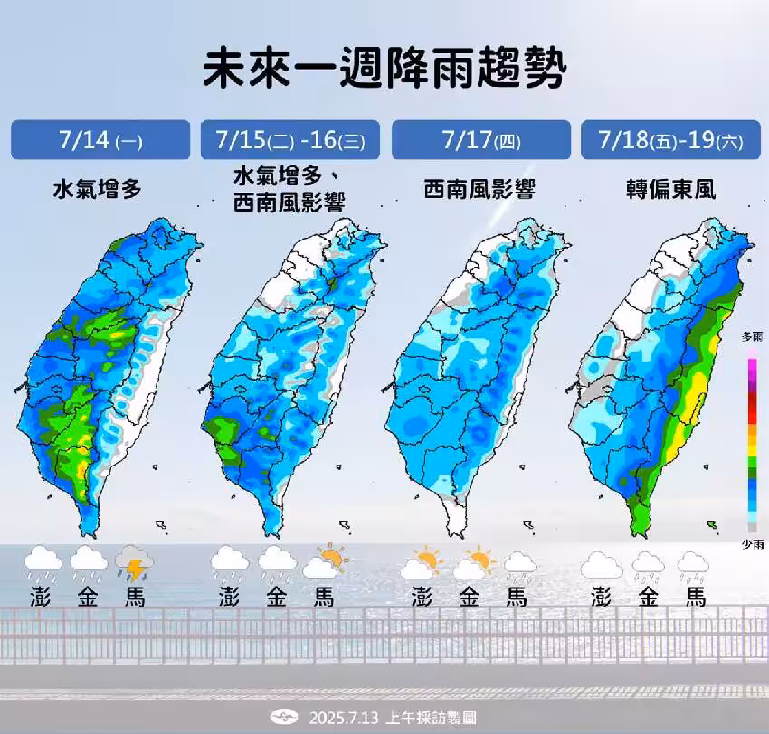 整周天氣不穩,午後易有雷陣雨。 中央氣象署表示,沒下雨時仍較悶熱,各地高溫約32至34度,花東縱谷及彰化地區有局部36度以上高溫。