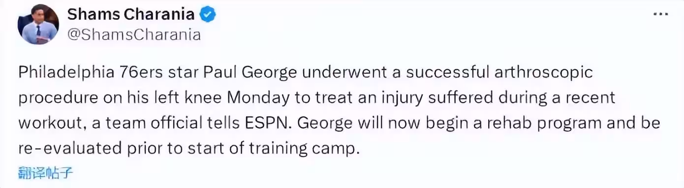 北京時間7月15日,ESPN知名記者Shams前方傳來報道,費城76人球星保羅喬治在訓練中導致膝蓋受傷,並且於今天接受了左膝關節鏡手術,關於喬治究竟遭遇了左膝何種傷病,Shams沒有明說,不過既然需要通過手術才能恢復,就說明傷得不輕,Shams還報道說,喬治將會在新賽季訓練營開啟之前接受複查,以便確定回歸賽場時間!