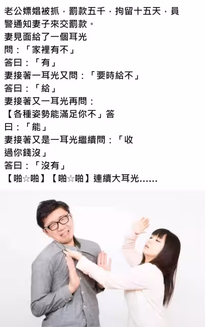 老公嫖娼被抓,罰款五千,拘留十五天,員警通知妻子來交罰款。