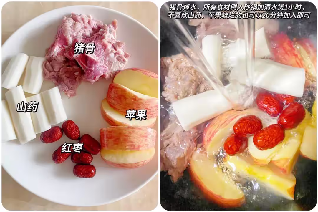 豬骨300克(選筒骨或排骨,油少更清爽)➕ 山藥1根(約200克)➕ 蘋果1個 ➕ 紅棗5-6顆(去核不上火)➕ 生薑3片 ➕ 清水適量
