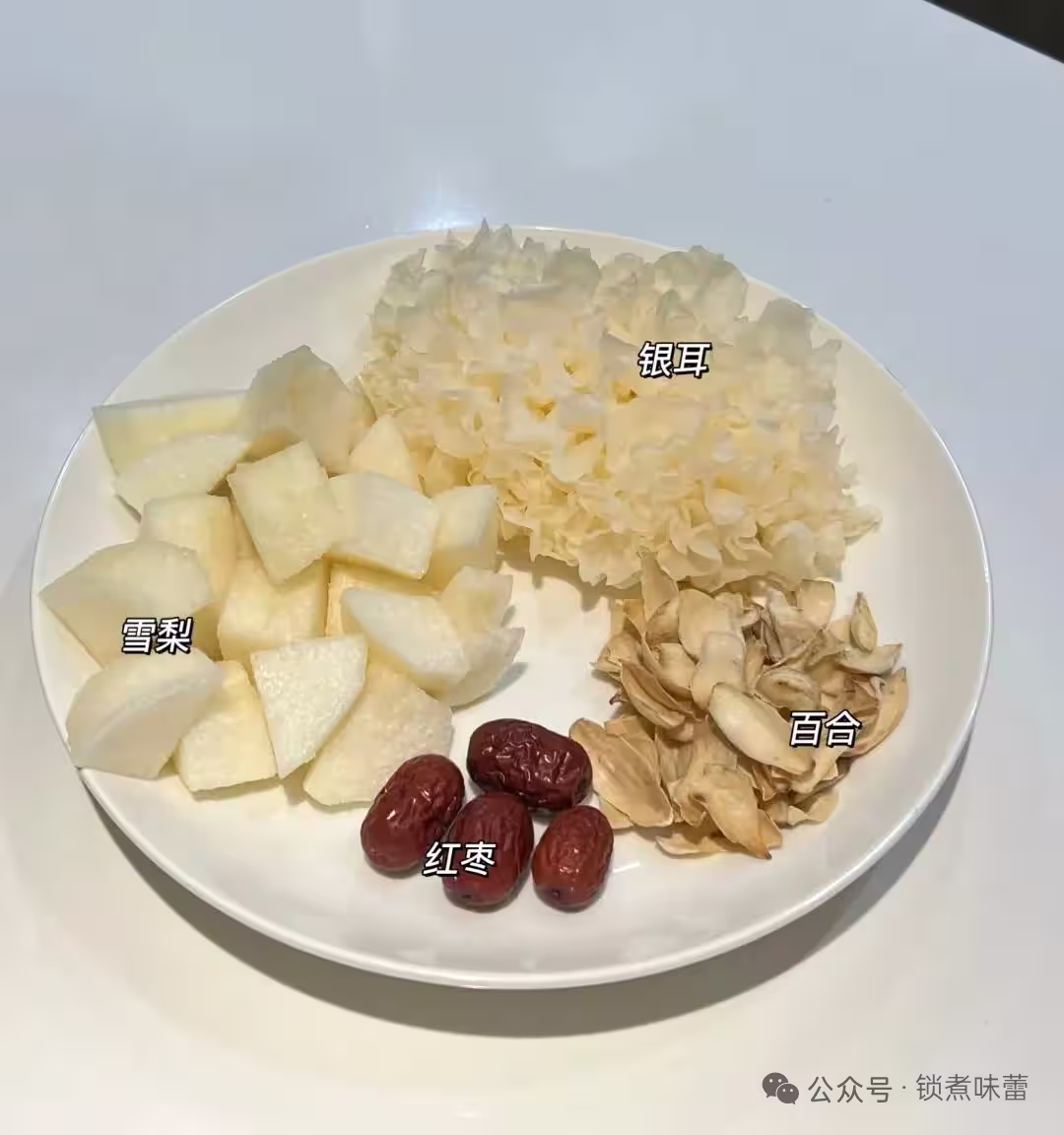 雪梨1個(選多汁的皇冠梨)、干百合10g(或鮮百合20g)、冰糖5-8顆(孩子小的少放)