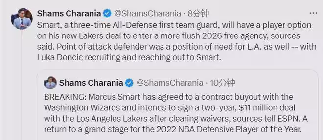 爆料王Shams:斯瑪特與奇才達成買斷協議,計劃度過澄清期後以兩年1100萬美元加盟湖人。若沒有買斷,斯瑪特25-26賽季的全額薪水本來能達到2134萬美元。