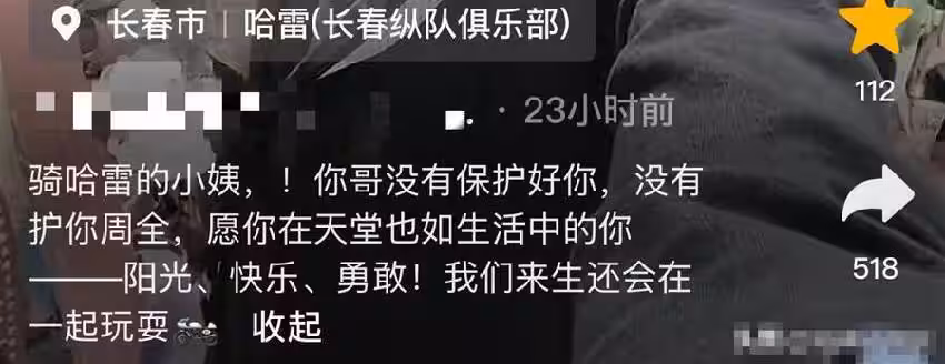 7月17號晚,大量來自吉林的網友分享悲痛消息,來自當地哈雷車隊的「最美女騎」騎哈雷的小姨不幸因交通事故去世,