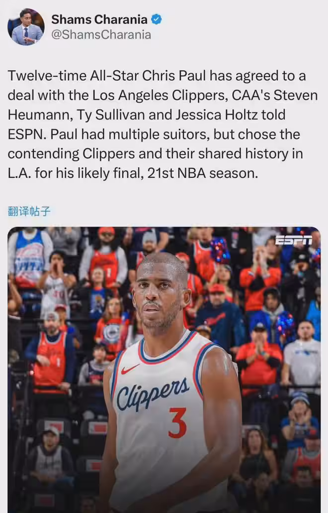 Shams:保羅回歸快船,同時25-26賽季為他的球員生涯最後一舞。