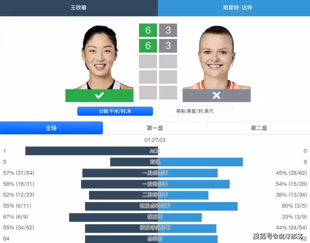 全場數據統計,兩人的雙誤都不少,王欣瑜5個、達特9個,也導致各自的一發成功率都不高,王欣瑜57%、達特45%。此外,王欣瑜的一發得分率58%、二發得分率52%、破發點轉化率55%、接發球得分率55%,整體表現可圈可點,明顯好於達特。