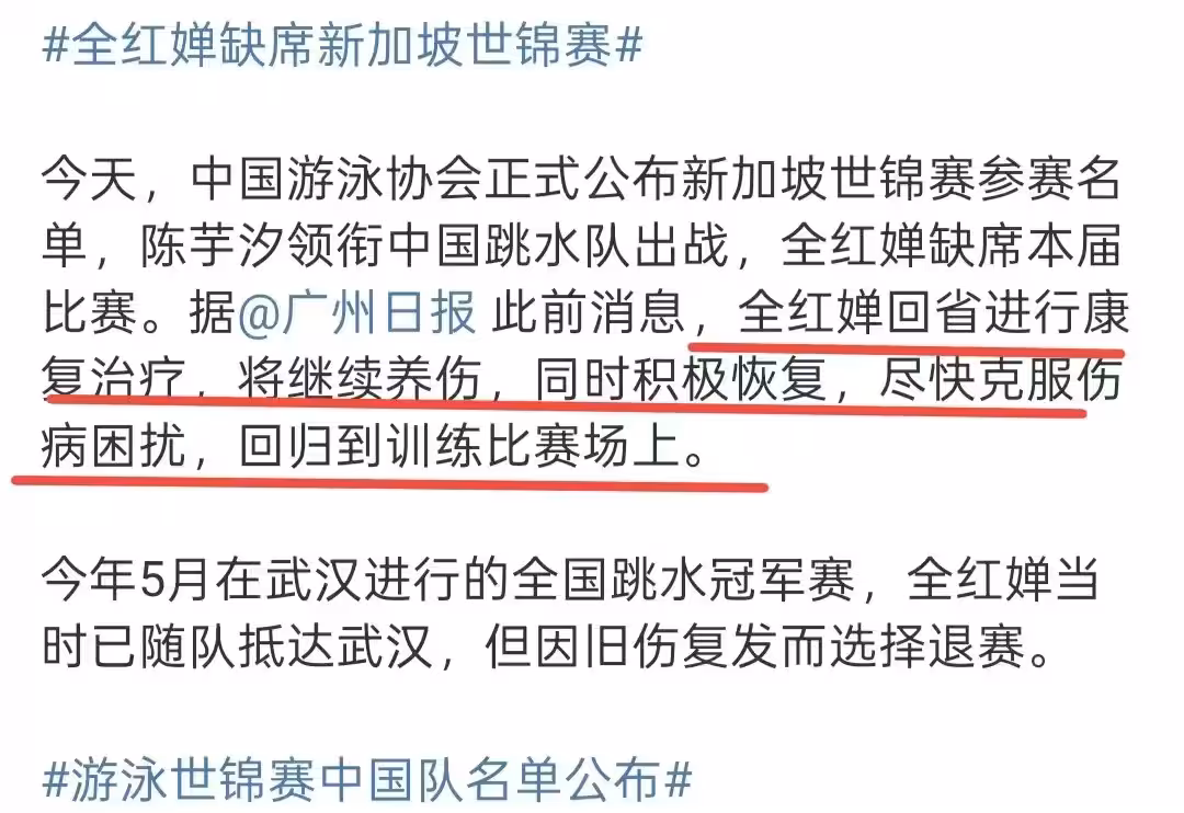 之前,全紅嬋因傷退賽引發爭議,明明官方已經給出了解釋,表示全紅嬋繼續養傷,儘快克服傷痛困擾,之後會回歸賽場。