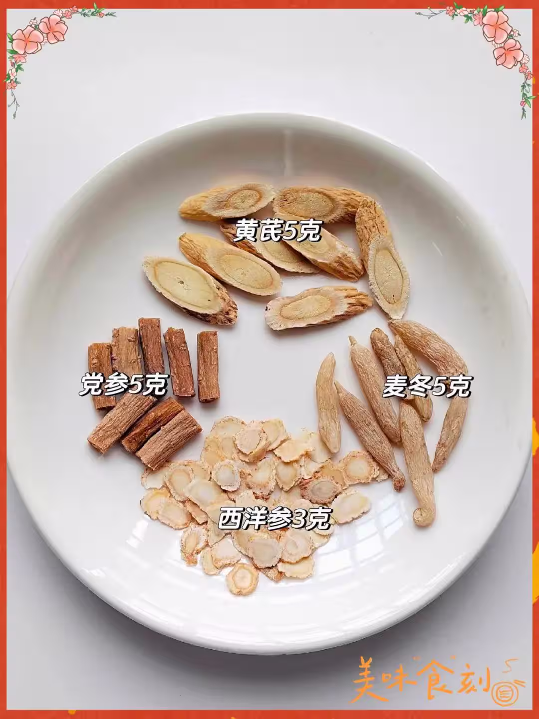1.取黨參、黃芪、西洋參、麥冬各5克,用水沖乾淨