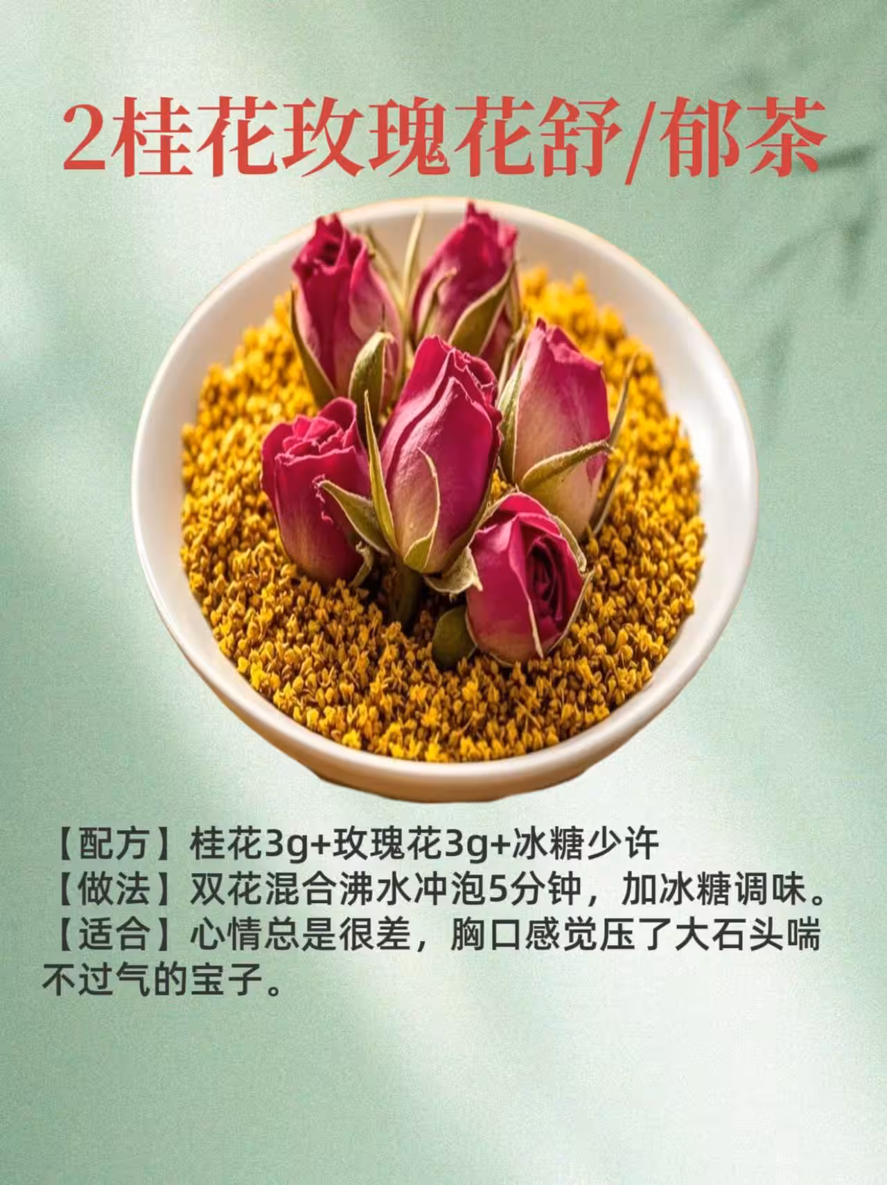 🌼桂花玫瑰花舒/郁茶:心情總是不好的寶子,試試桂花玫瑰花茶吧!雙花混合沸水沖泡,加點冰糖,喝完感覺心情都舒暢了,胸口的悶氣也散了~