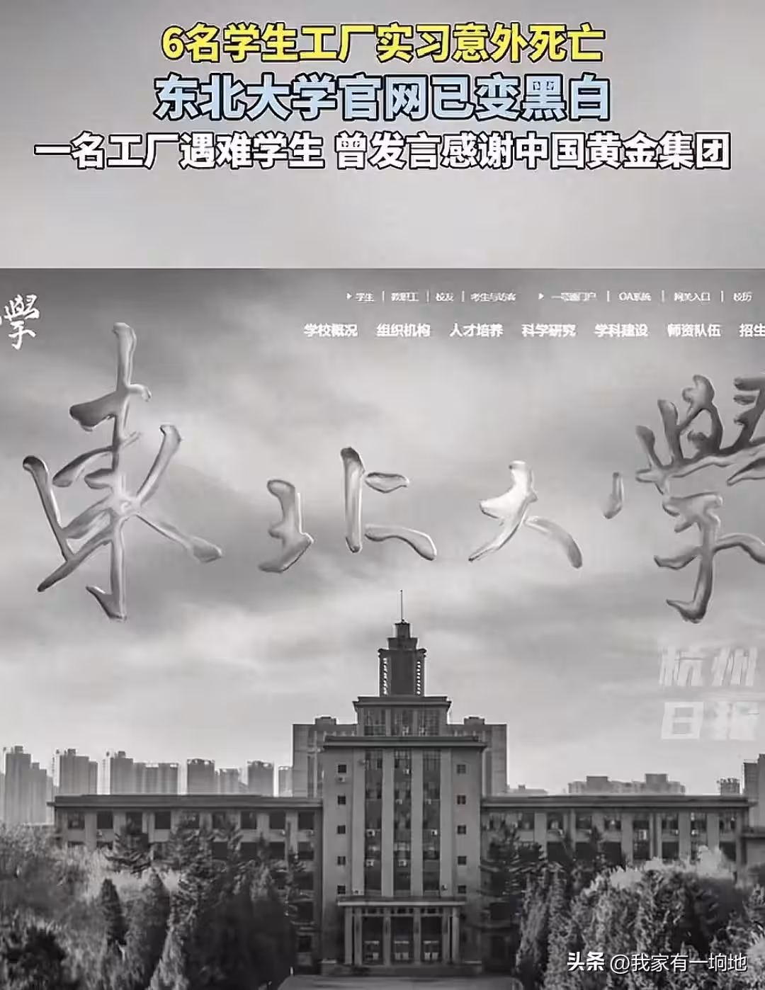 7.25日,東北大學官方網站已經全部變黑。進行默哀以及悼念,這次事故對東北大學也是一個打擊,每年都有校外實習組織,今年在中國黃金集團內蒙古選礦廠讓6名學生丟命。