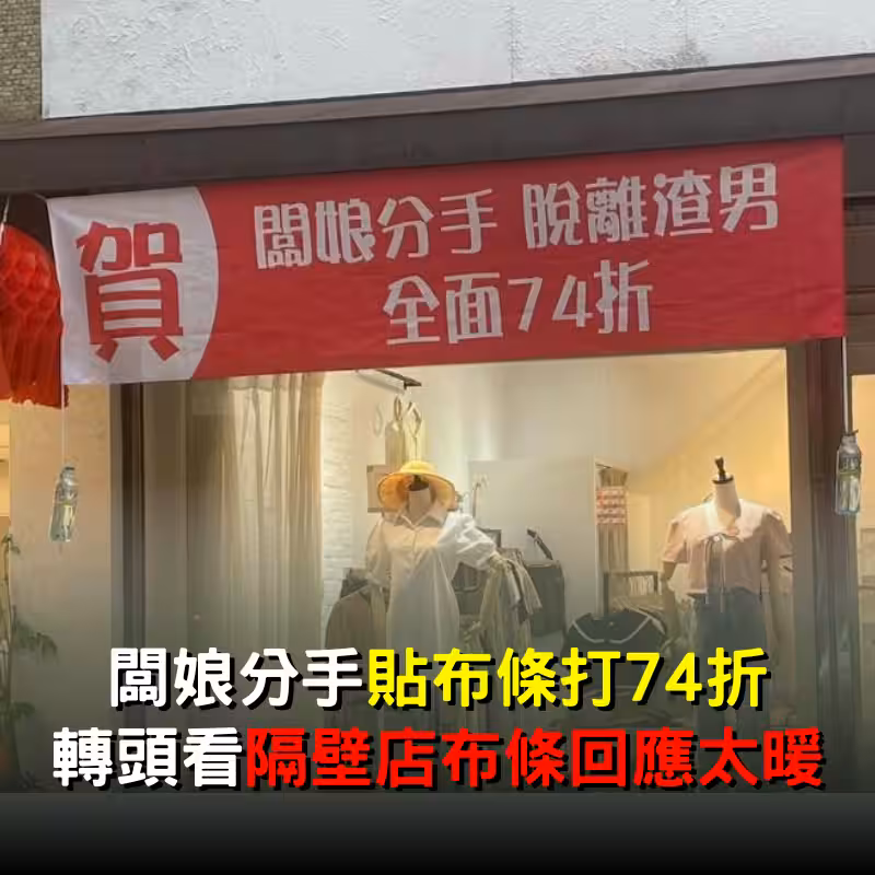 老闆娘分手!!氣憤貼布條「脫離渣男」全面打折 瞄向隔壁「跟著掛布條回應」網笑翻:感情真好~