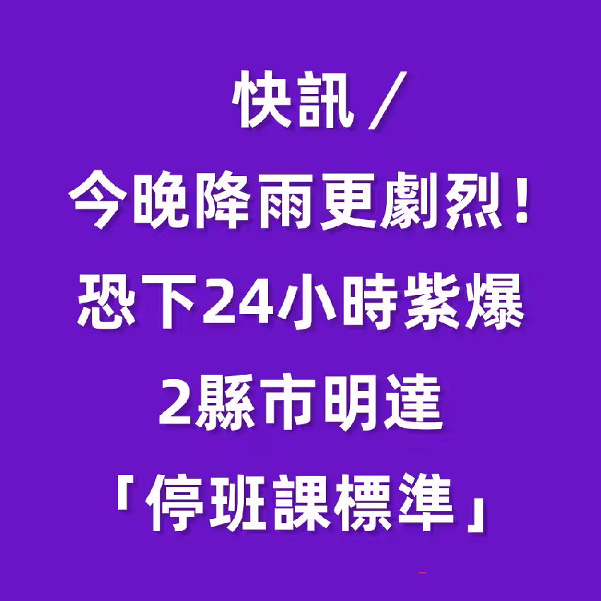 快訊/今晚降雨更劇烈! 恐下24小時紫爆「2縣市明達停班課標準」