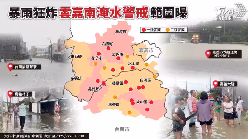 首波受災區域包括嘉義縣、台南市後壁區、雲林縣水林鄉與嘉義六腳鄉,已於28日率先宣布停班停課。