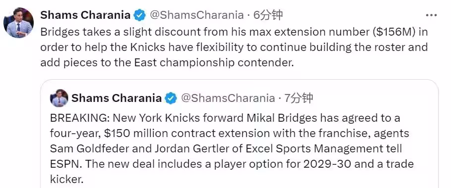 爆料王Shams:布里奇斯四年1.5億美元提前續約尼克斯,該合同包含29-30賽季球員選項和交易保證金。