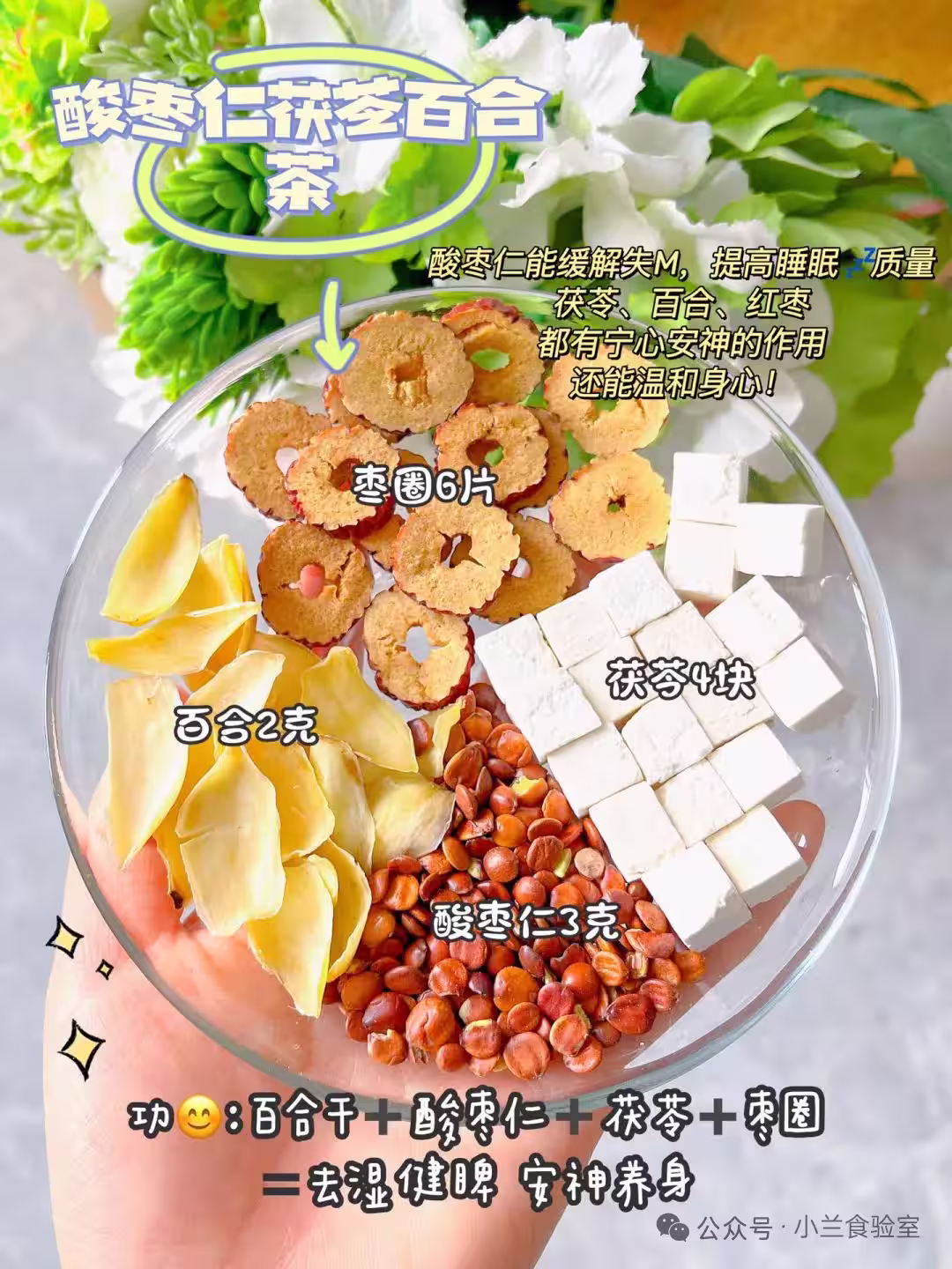 - 去濕健脾、安神養身、寧心安神。酸棗仁緩解失眠,茯苓和百合溫和身心,提高睡眠質量。