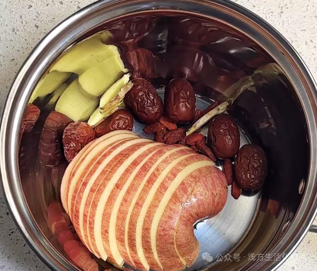 食材:蘋果1個(帶皮切塊)、生薑3薄片、去核紅棗5顆、肉桂棒半根(約3厘米)