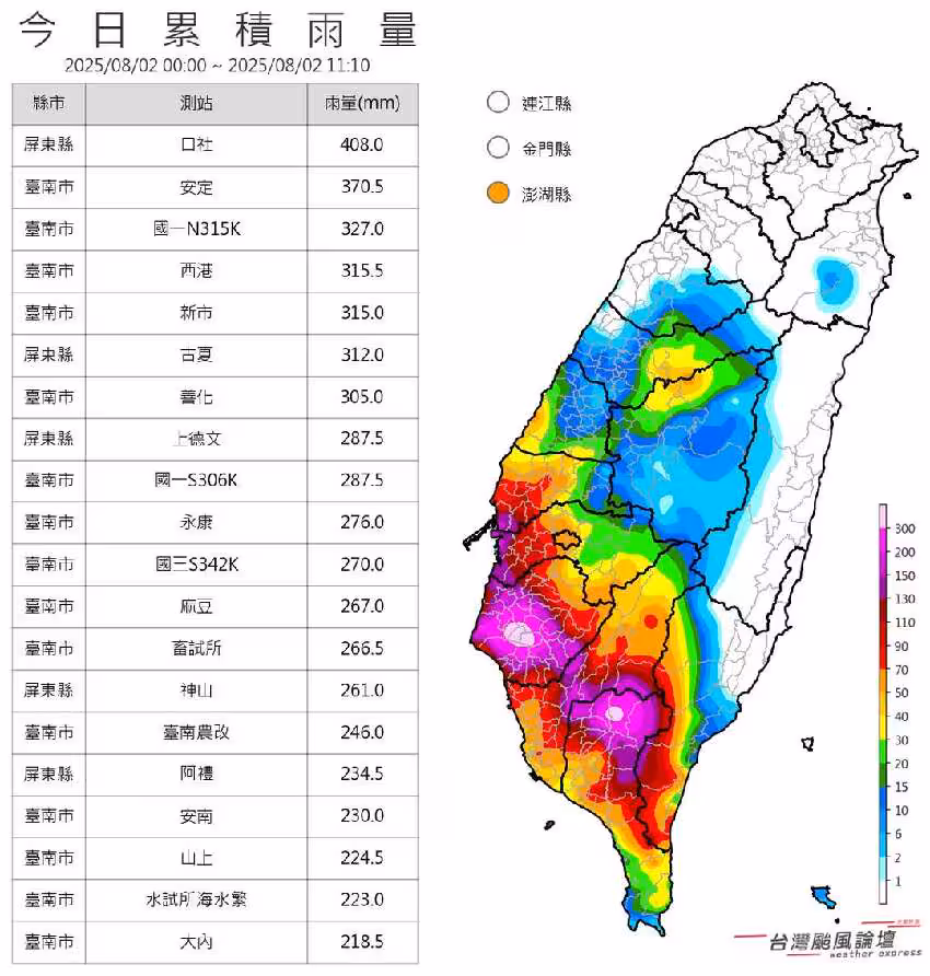 最後,「台灣颱風論壇|天氣特急」急喊「台南大範圍猛烈雨勢,安定已突破370毫米!」