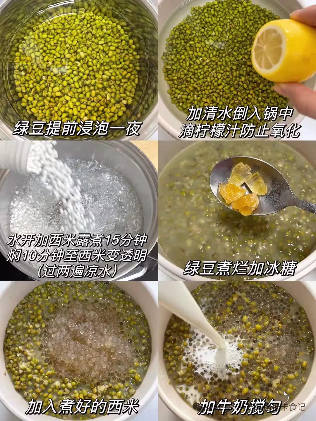 綠豆提前用清水浸泡一晚,更容易煮爛。泡好的綠豆加清水倒入鍋里煮。煮西米的水燒開後放入西米,滴幾滴檸檬汁(防止西米粘一起),煮15分鐘左右,關火燜10分鐘,直到西米中間的白芯消失變全透明,撈出用涼水沖兩遍。
